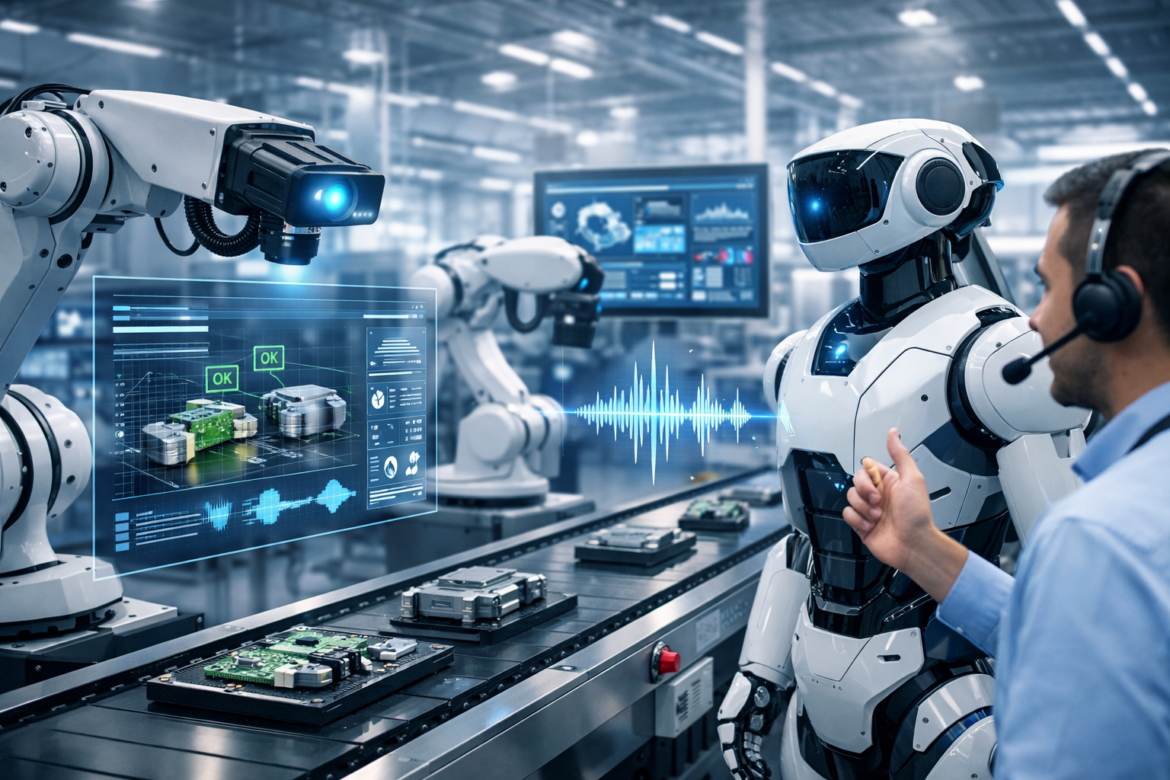 AI vision detects tiny defects in components, while voice control helps manage complex assembly processes.